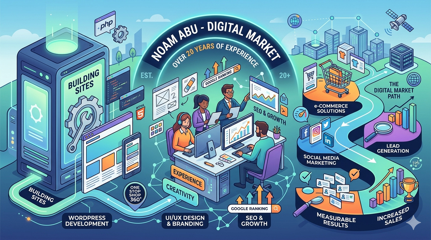 אני שמח לארח אתכם אצלי. אם אתם כאן, אתם בטח מבינים שבניית אתר מקצועי, עדכני ואיכותי היא לא מותרות – היא צורך קריטי בשווקים התחרותיים של המאה ה-21. שמי נועם אבו, הבעלים של דיגיטל מרקט, ואני חי ונושם את עולם בניית האתרים, המיתוג והקידום בגוגל כבר למעלה מ-20 שנה.